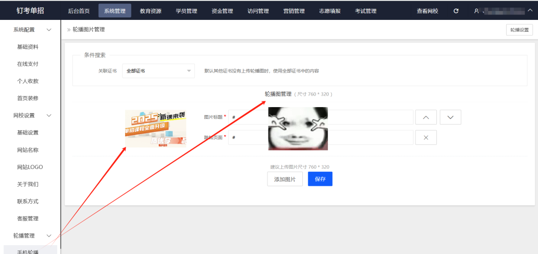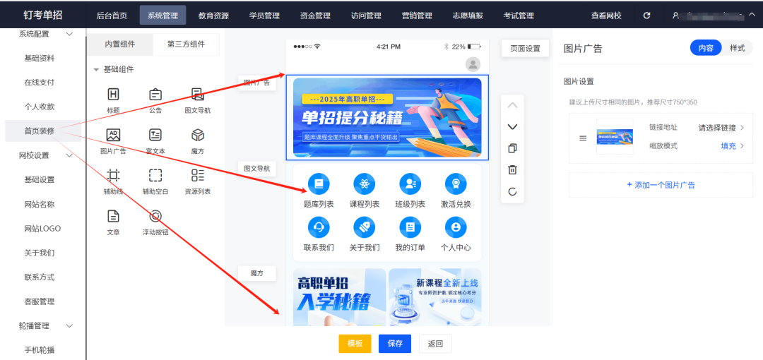 手机是单招考生获取信息的主要渠道,而手机端轮播图作为首页视觉焦点,堪称“一秒抓睛”的黄金宣传位。钉考赋予机构完全的轮播图自主设计权,让每一张图片都成为传递品牌价值的有效载体。