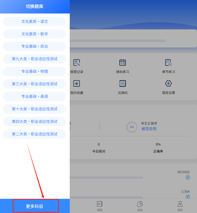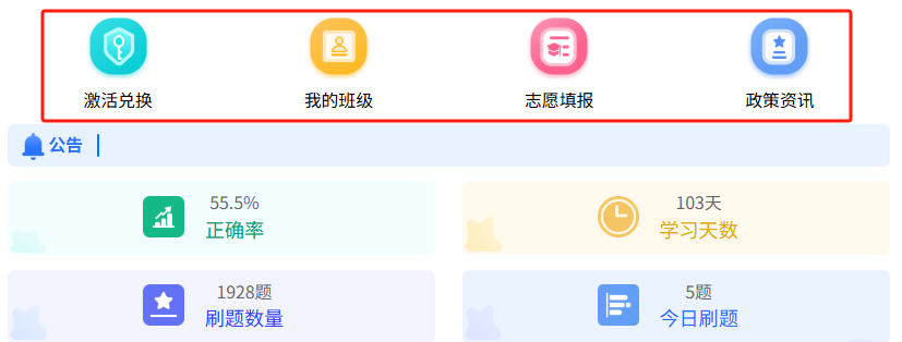 • 做题数据统计模块可视化展示学习进度,督促学员持续学习;金刚区整合激活兑换、我的班级、政策资讯等核心功能,学员一键直达常用场景。