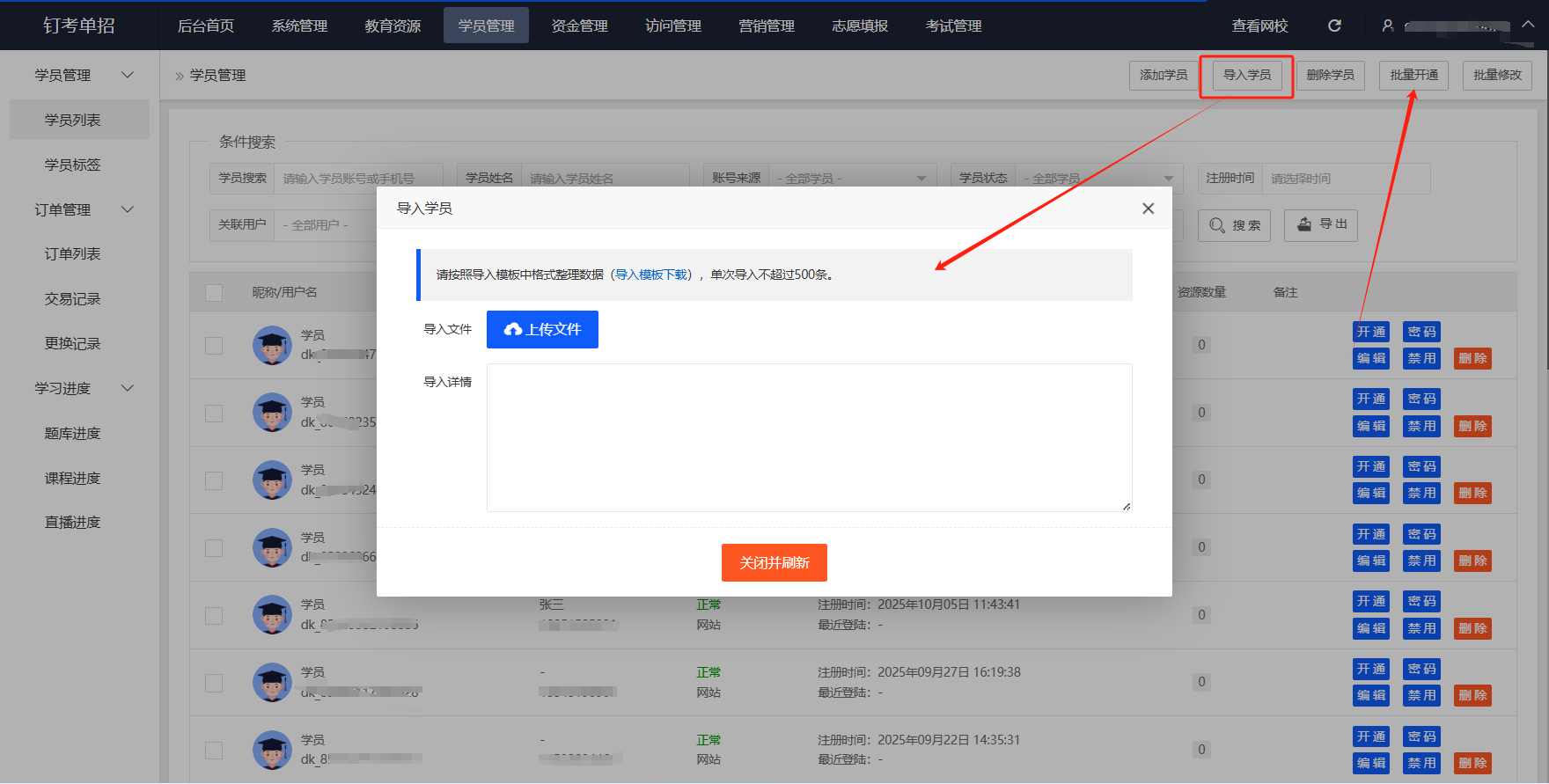 • 批量操作高效便捷:支持学员信息批量导入、学习卡兑换码批量生成,大幅节省人工成本,提升运营效率。