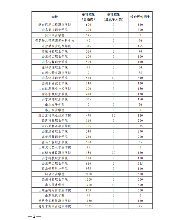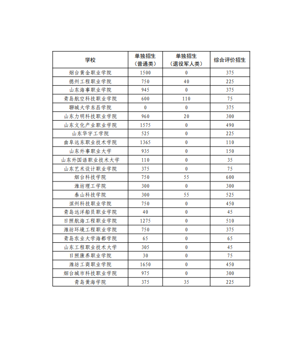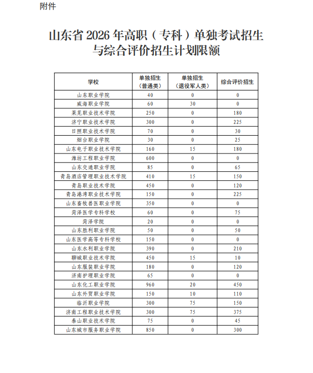 附件:山东省2026年高职(专科)单独考试招生与综合评价招生计划限额