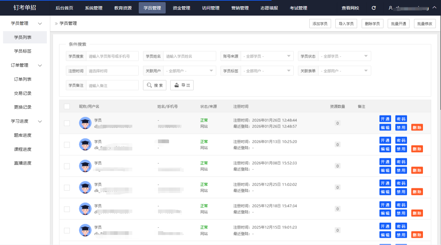 单招机构大多是小团队,没人手做复杂的运营管理,钉考SaaS网校把教务、学员、财务、数据管理全整合在一个平台,一人就能轻松操作: