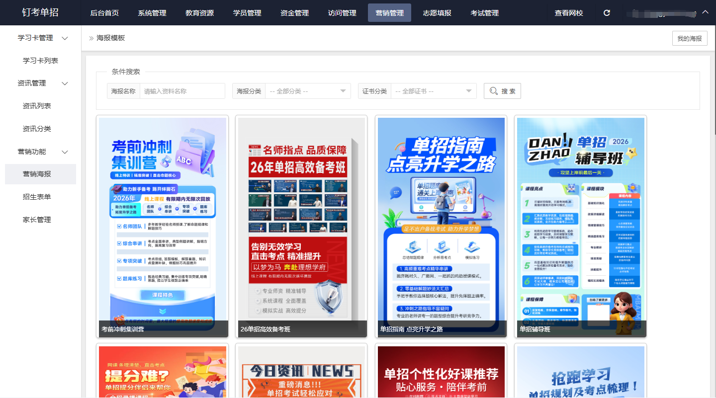 搭建网校的核心目的是招生增收,钉考SaaS网校自带专属的营销工具,贴合本地单招机构的获客需求,让网校不只是教学工具,更是招生利器: