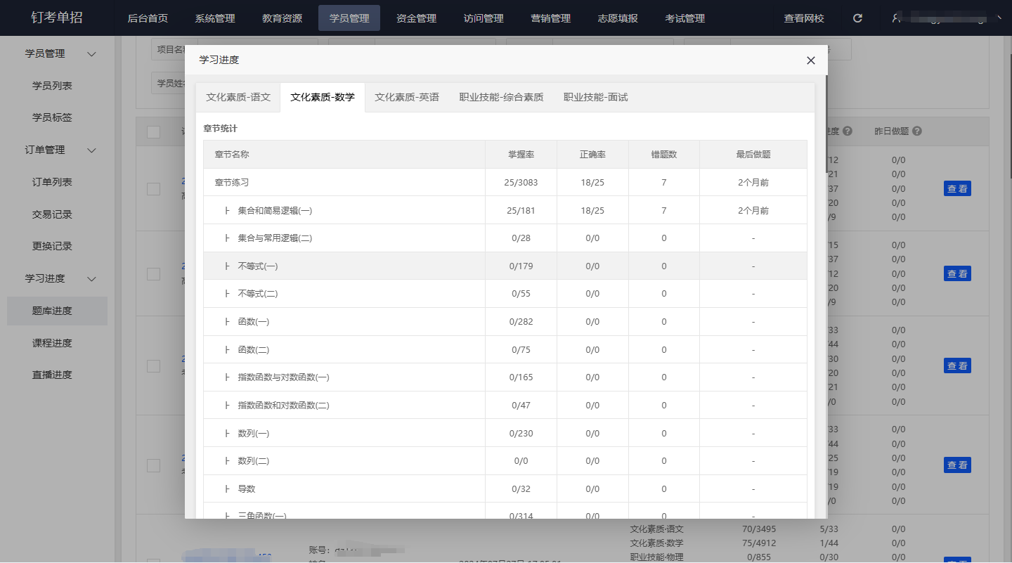 • 实时查看学生听课进度、刷题量、正确率、薄弱知识点;